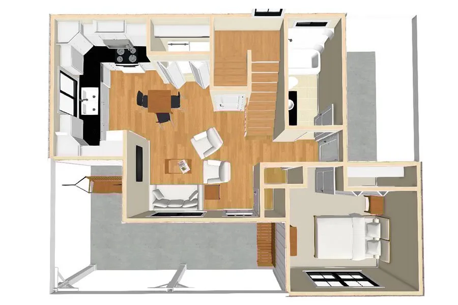 The porch swing of your dreams awaits on the wrap-around front porch of this charming two-bedroom house plan. The living room greets you upon entering and leads to the kitchen, while the utility closet is conveniently positioned adjacent to the kitchen.