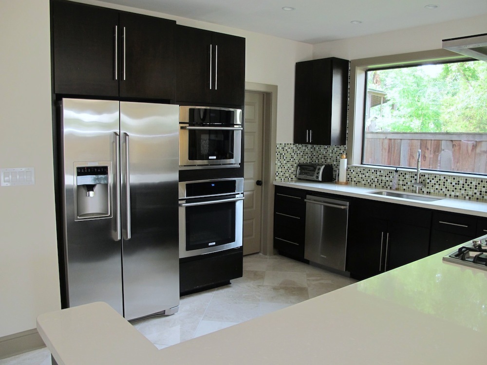 A U-shaped kitchen with black accent drawers and cabinetry.