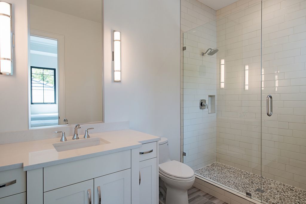 Bathroom features shower with glass enclosure, toilet, and vanity.