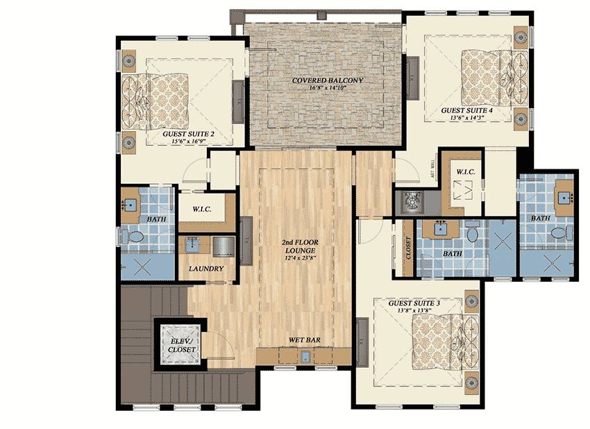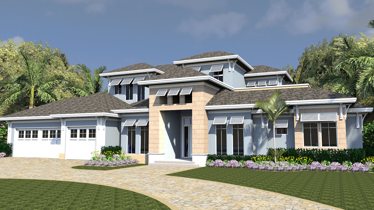 Welcome to our house plans featuring a 2-story 4-bedroom southern Florida upscale home floor plan. Below are floor plans, additional sample photos, and plan details and dimensions.