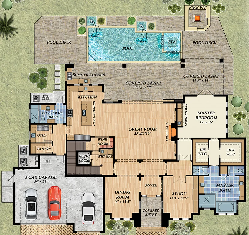 Take advantage of all the abundant features that come with this affluent Florida house plan. On the enormous rear-covered lanai, there is a wet bar, wine room, residential elevator, and an outdoor summer kitchen. There are very few walls to hinder views with such a lovely open floor layout. You can, however, retreat to the solitude of a quiet study with built-ins along one border.
