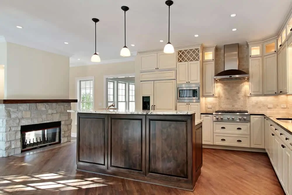 This kitchen is designed with old world charm in mind. The dark wood cabinets with custom detailing are grand and luxurious. The substantial island is designed to look aged like a family heirloom.