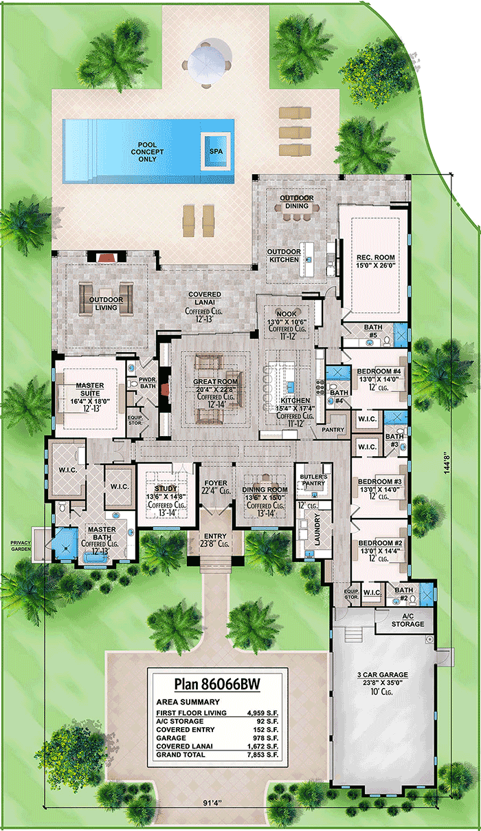 Welcome to our house plans featuring a single-story 4-bedroom lavish Florida home floor plan. Below are floor plans, additional sample photos, and plan details and dimensions.
