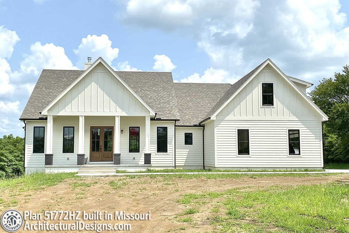 An exterior look at the contemporary farmhouse, showcasing the vaulted side bonus room.