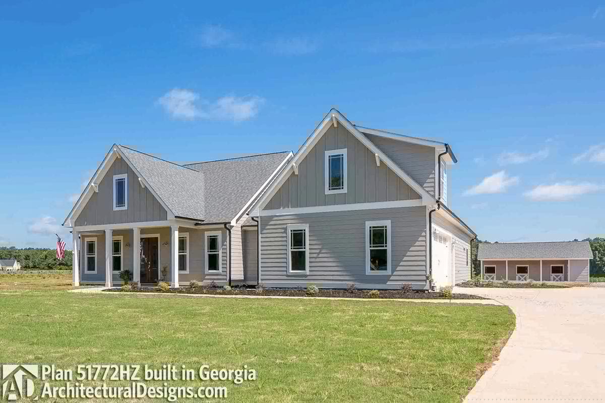 Welcome to our flexible ranch country home plan. This floor plan has a Craftsman exterior elevation and tons of space inside. The 3-car garage, spacious kitchen, and large bonus area make this home a perfect choice for anyone looking for country charm with flexible options.